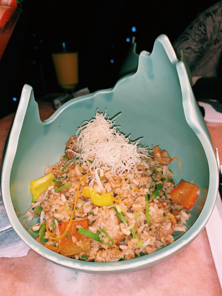 At night, the place comes to life. A warm light shines on the orange hanging flowers, and to set a good mood for dinner. There is a combination of partially dark ambience with the use of orange light to make it a perfect setup for intimate dining, whether with friends, family or a date. There was a Dj playing music to complement the mood of the space. It was kinda full though at the bar area side, so maybe not ideal for people who don’t like crowds.