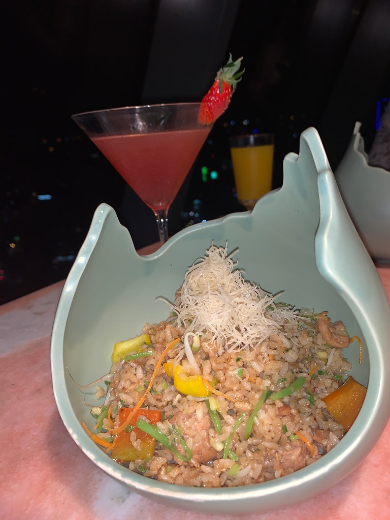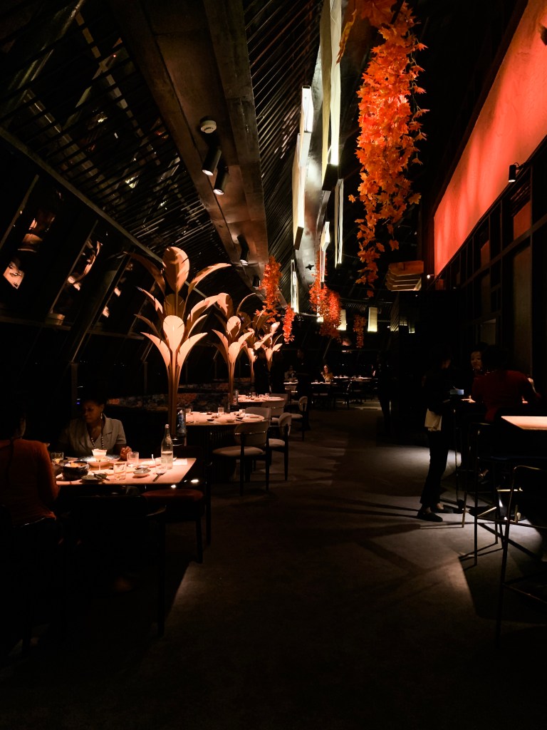 The atmosphere is utterly breathtaking. The place is modern with a touch of oriental. Natural elements, such as the bamboo overhang at the bar area and there are hanging orange flowers at the restaurant seating. The place is rather open, with the curtain wall to light up the space during the day whilst allowing one to get amazing views of the city.