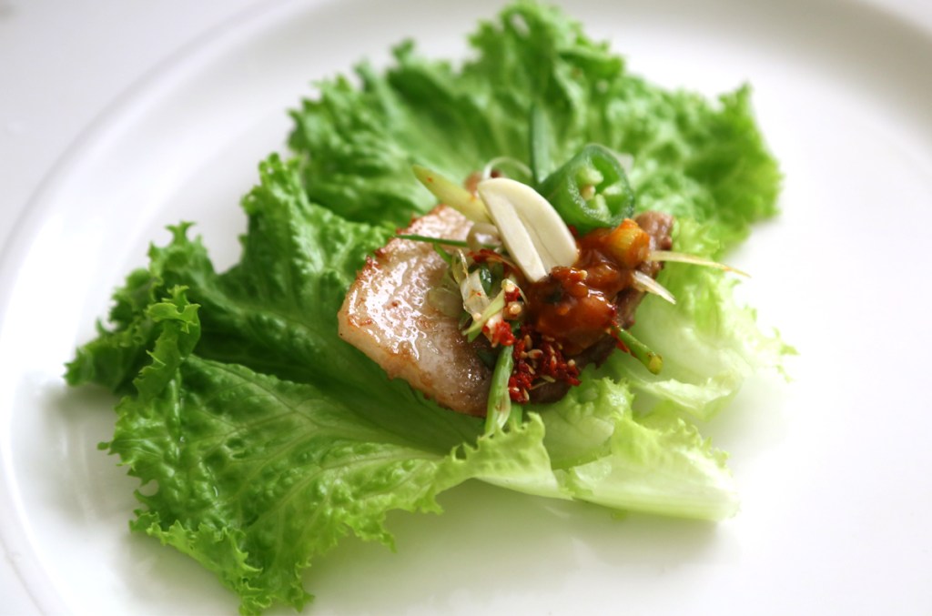 Samgyeopsal consists of non-marinated grilled slices of pork belly. It is usually dipped in a salt and pepper seasoning. The pork is eaten by being wrapped in lettuce along with grilled garlic slices, onion slices, shredded green onions and kimchi. It is a common dish in many Korean restaurants throughout the world – The famous Korean BBQ dish.
